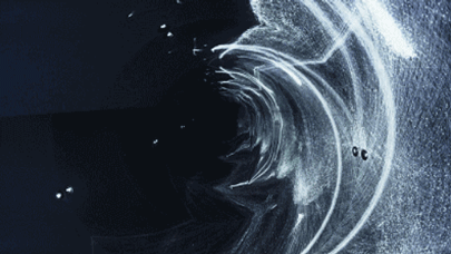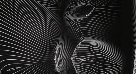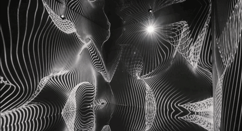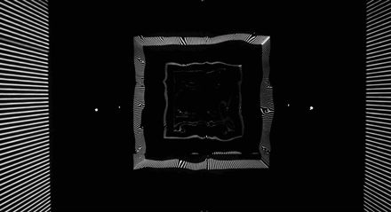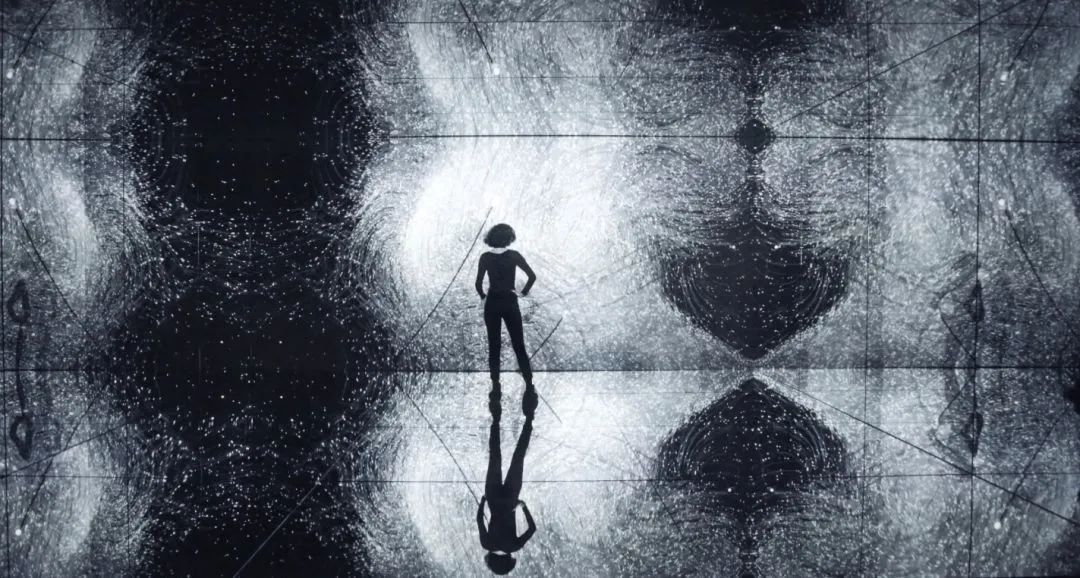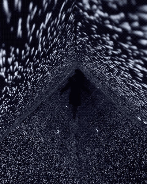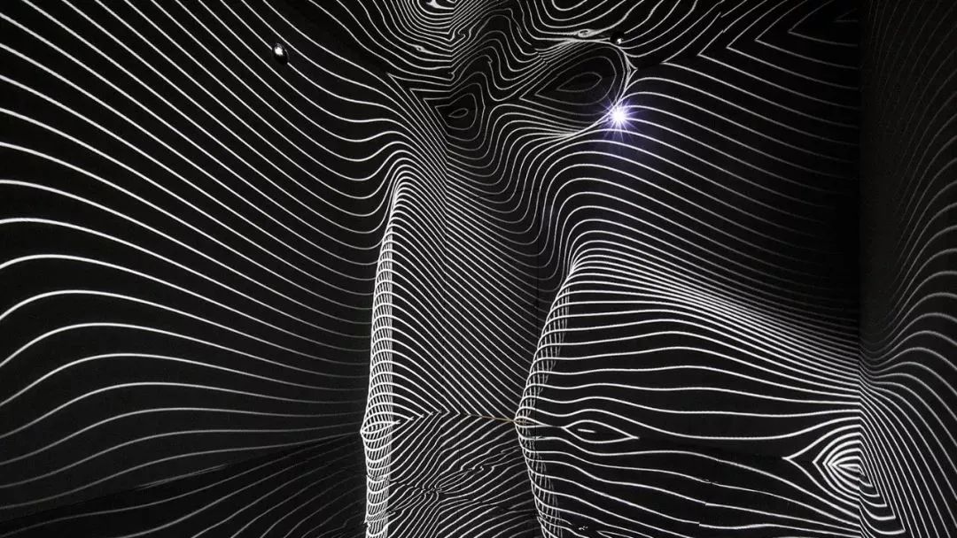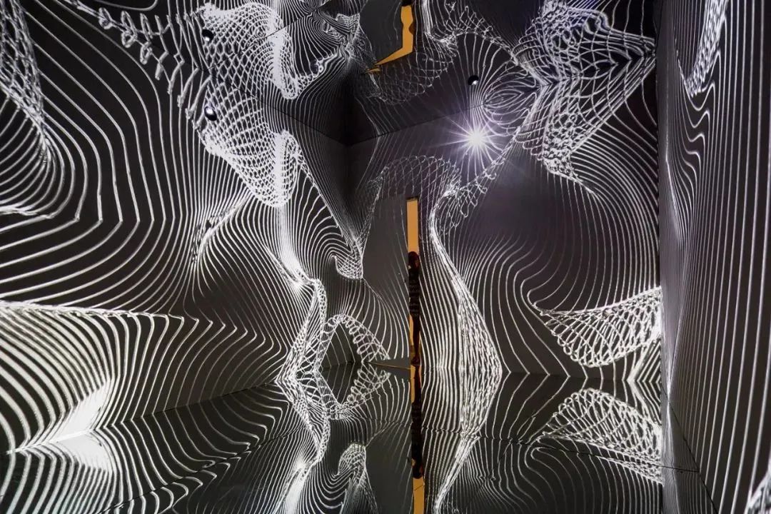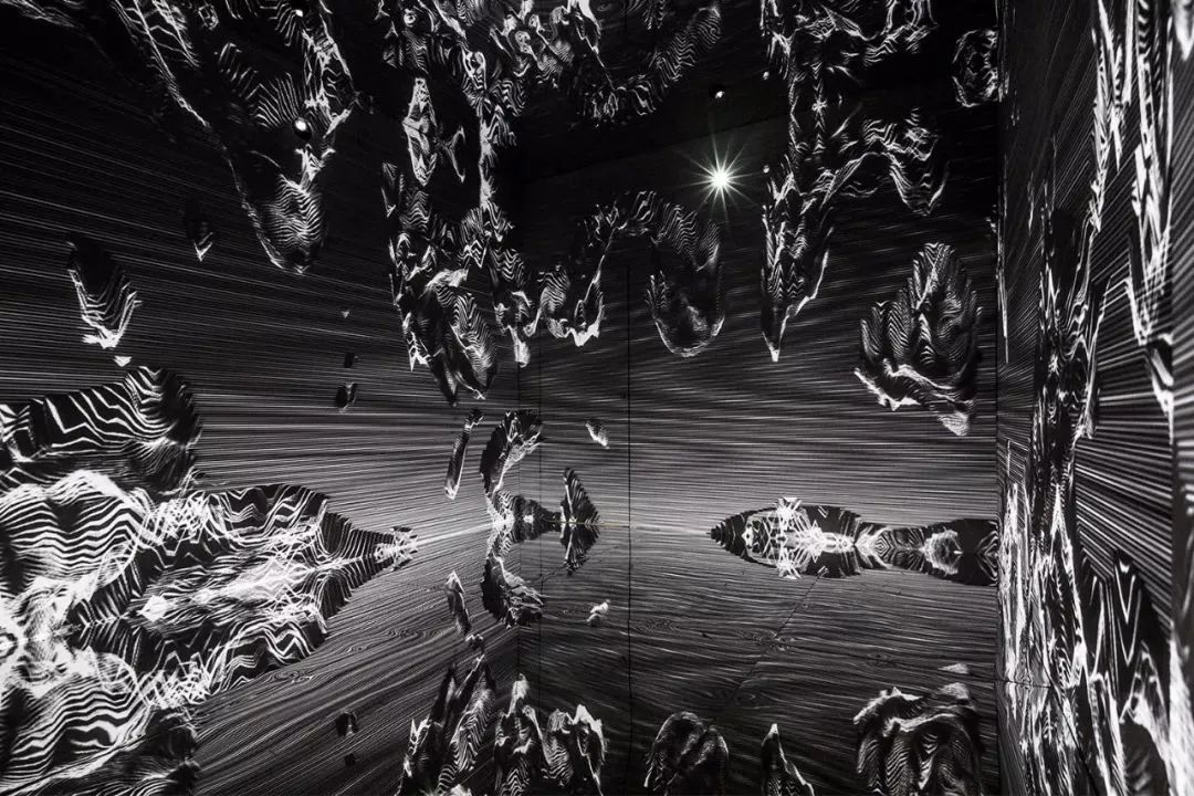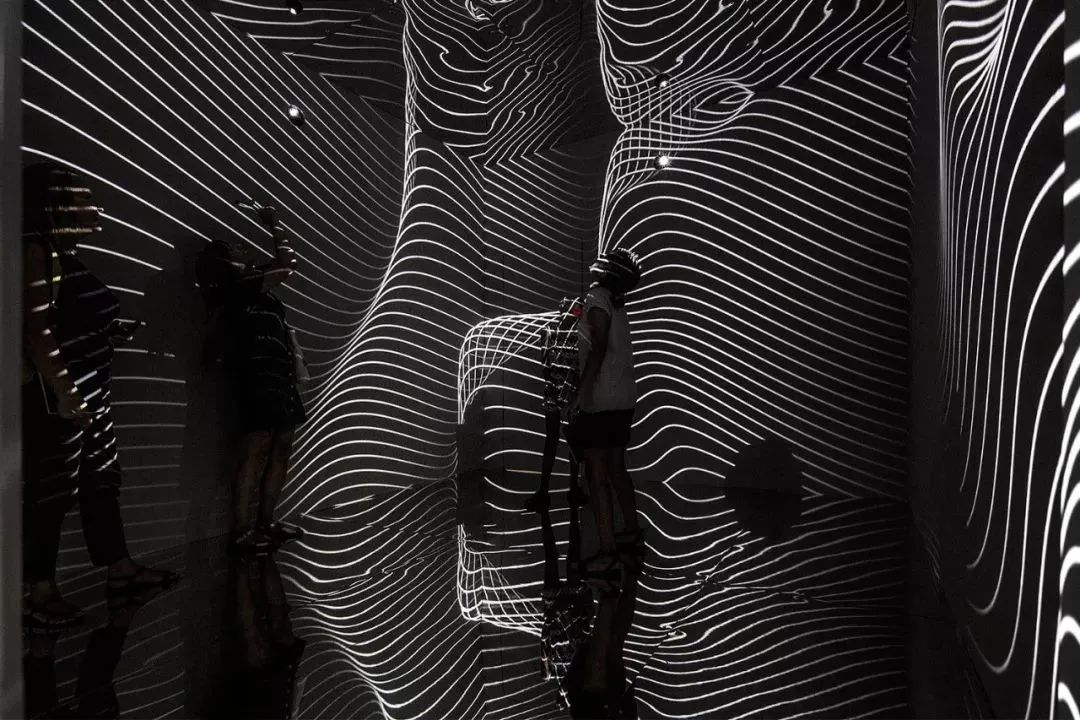 黑白基調(diào)的11分鐘投影包括螺旋線(xiàn)條、黑洞、枯山水似的動(dòng)態(tài)圖像,仿佛一個(gè)鏡面版的時(shí)空隧道。