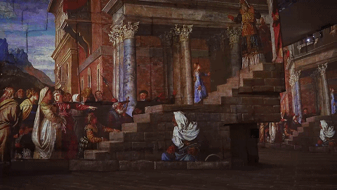 觀眾好像漫步在大運河和運河、小巷和廣場、建筑和教堂。在水城內外,感受神秘和煙火氣,探尋過去的、非凡的、可見的符號,有種置身威尼斯的沉浸感。觀眾可能會沉浸在拜占庭藝術和圣馬可大教堂的金色馬賽克中,沉浸在丁托列托、貝利尼或卡納萊托的杰作中,甚至沉浸在著名的莫斯特拉德爾電影院中,欣賞意大利新現(xiàn)實主義女演員的表演和照片。