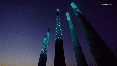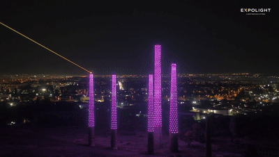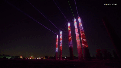 目前,Expolight 用2500像素燈覆蓋了管道,并在每個管道頂部安裝了60W 激光器。它們的色階和動態(tài)可以根據(jù)事件和假期進行編程。