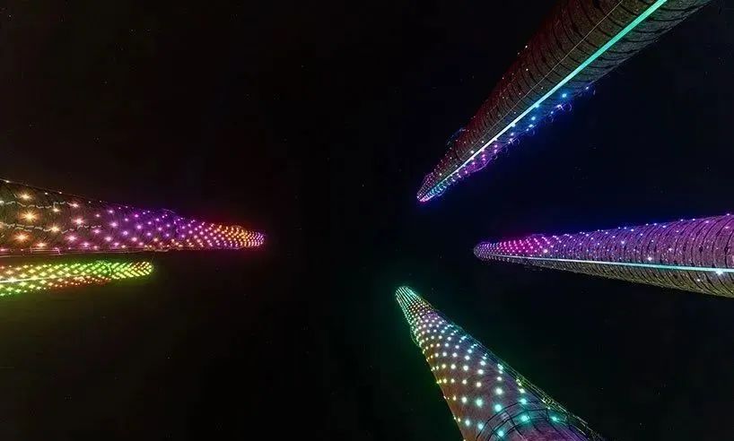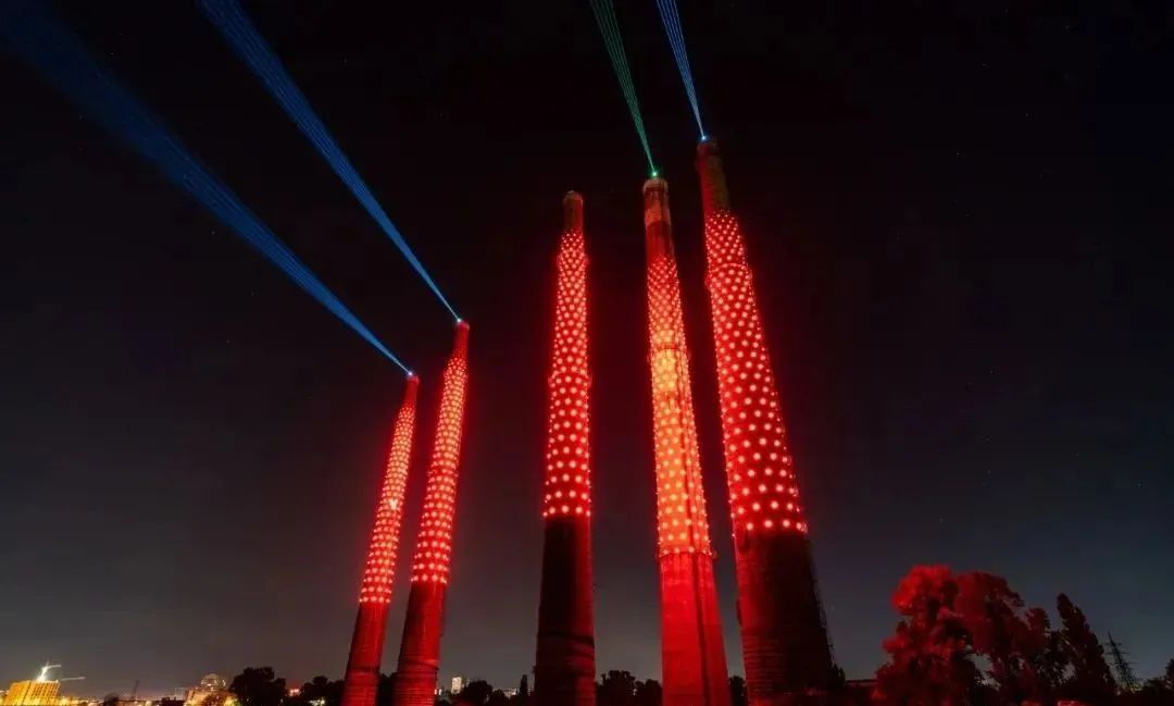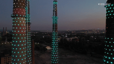 在烏克蘭的第聶伯羅市的一個老廠區(qū)里,完好的保留著13個閑置煙囪。最近,當?shù)毓ぷ魇?Expolight 對其中五個煙囪進行了改造,將它們轉化為 "盛開的數(shù)字鮮花",并獲得了2021美國LIT照明設計獎。