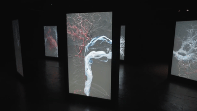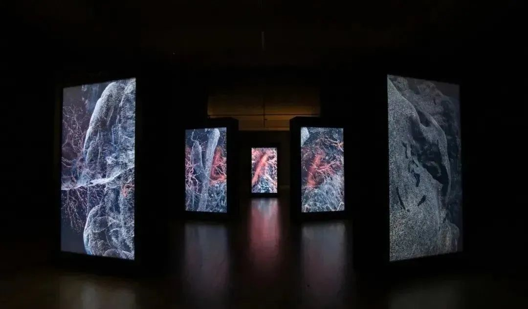 作為 Marshmallow Laser Feast 不斷探索超越我們感官極限的世界的一部分,五屏實(shí)時(shí)互動(dòng)裝置《The Tides Within Us》研究了氧氣在心血管系統(tǒng)中的流動(dòng),將人體描繪成一個(gè)流動(dòng)的事件,更像一個(gè)漩渦,而不是一個(gè)靜止的物體。