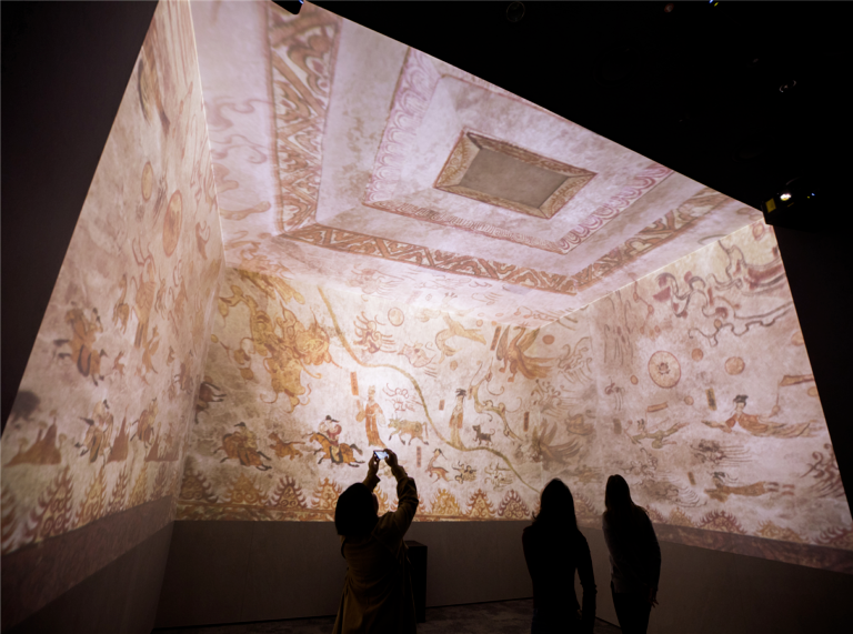 3D數(shù)字影像從四面(前墻、左右墻和天花板)投影,再現(xiàn)了高句麗古墓的壁畫(huà),仿佛站在真正的陵墓內(nèi)。
