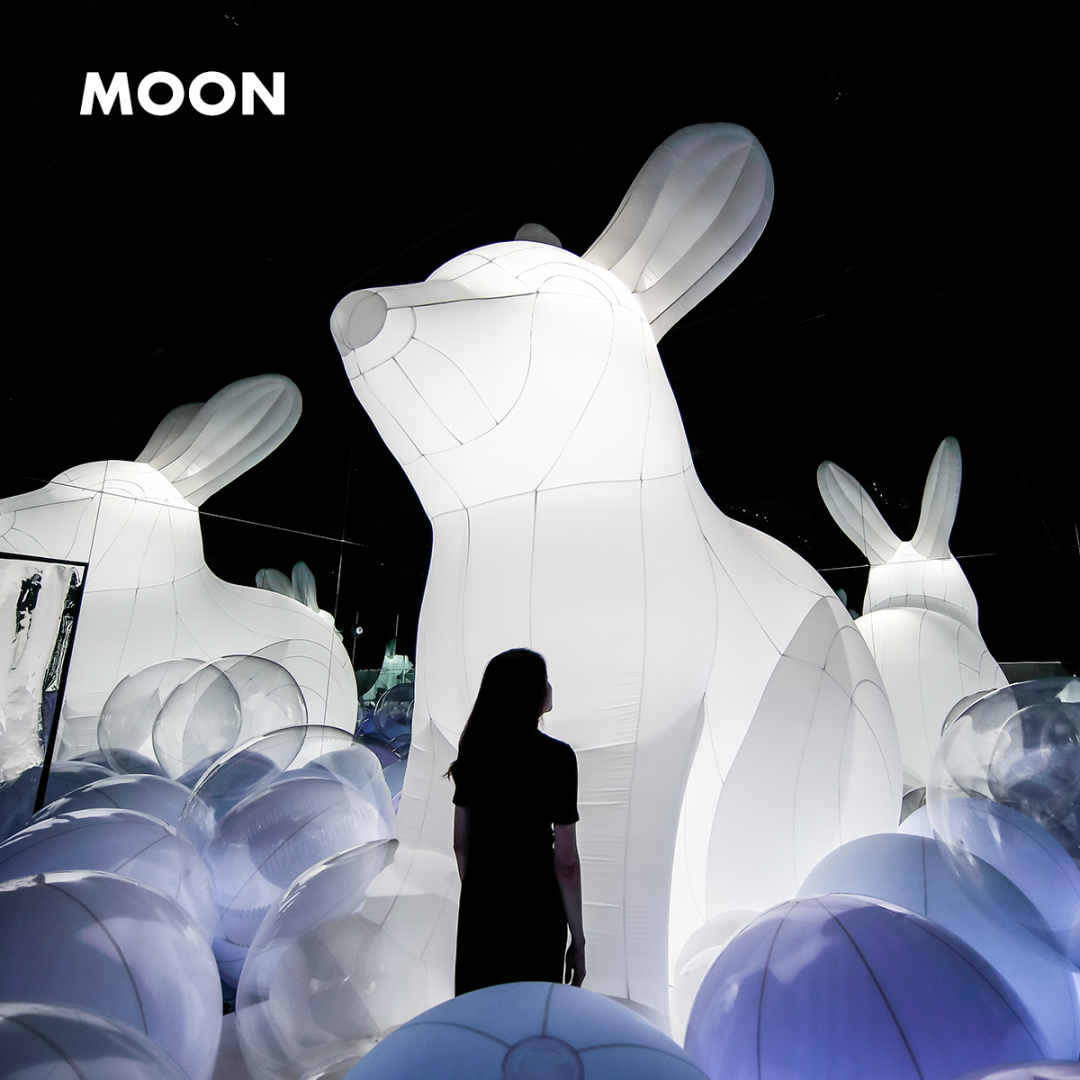 與帶著月光的球中相遇月兔。坐在月球上,等著4米大小的超大型兔子一起玩耍的朋友。在鏡中變得無(wú)限的球中,用我的手改變著形形色色的月光,尋找月兔。