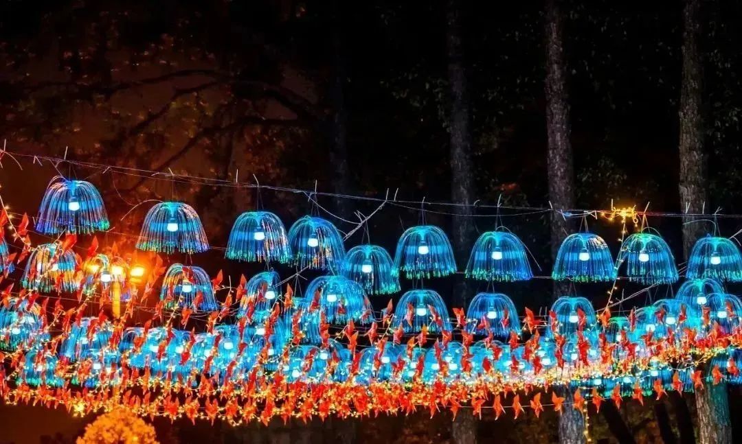 武漢植物園入口,空中低懸的海洋水母燈組成夢幻燈陣,不停地變幻著蔚藍(lán)、粉白光暈,閃耀迎賓。