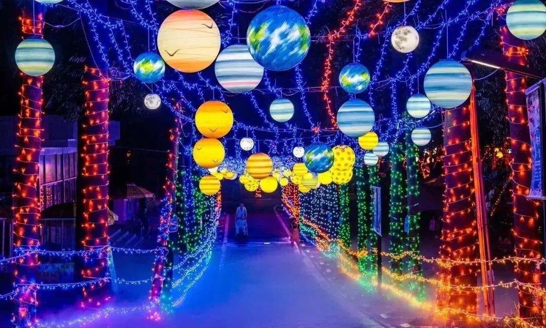 百米行星夢幻長廊最為耀眼奪目。中心草坪旁的樟樹大道化身美輪美奐的星空長廊,800組藍(lán)色燈串編織成蔚藍(lán)天幕,200個星球在空中串聯(lián)成璀璨星河,大小各異的行星參差錯落分布,絢爛無邊,人在“星河”下行走猶如太空漫步。