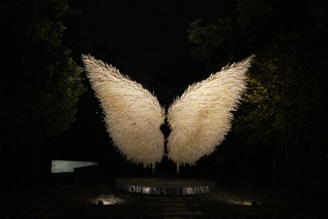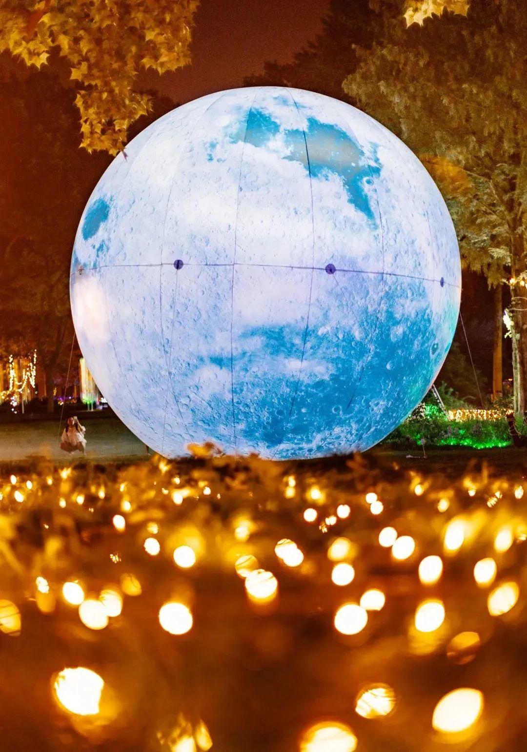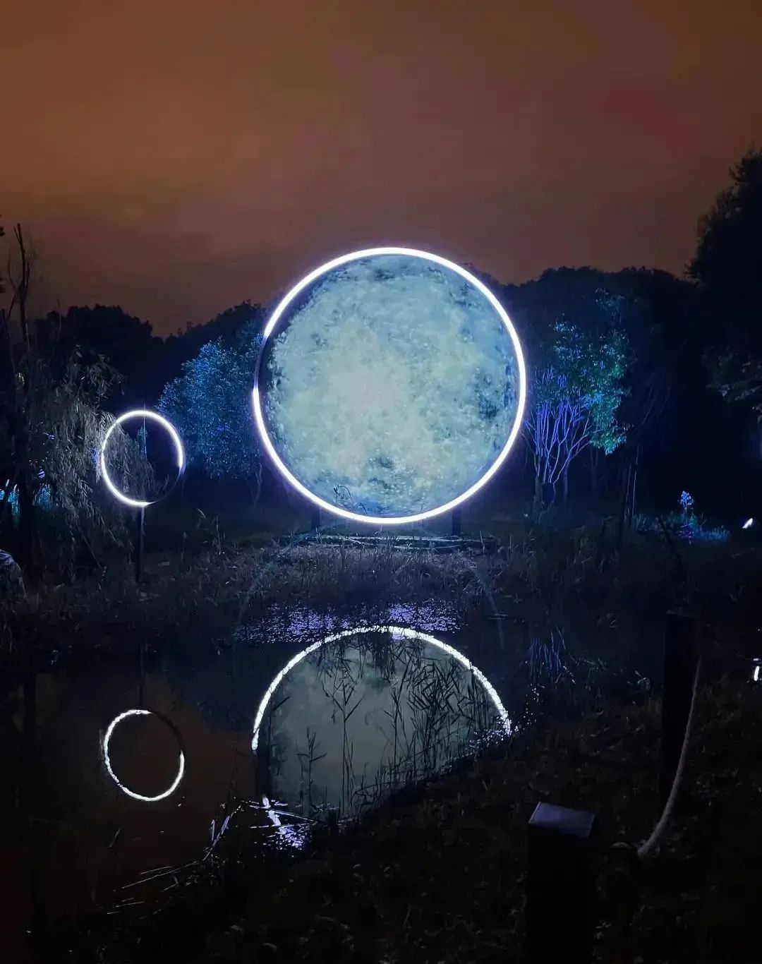 中心草坪上,一輪碩大的圓月輕吻草地,月波清霽,浪漫滿分。充滿科技感的天使之翼光影閃爍,十分吸睛。幾個纖長明亮的光纖簾佇立在草地上,有“火樹銀花”之感。