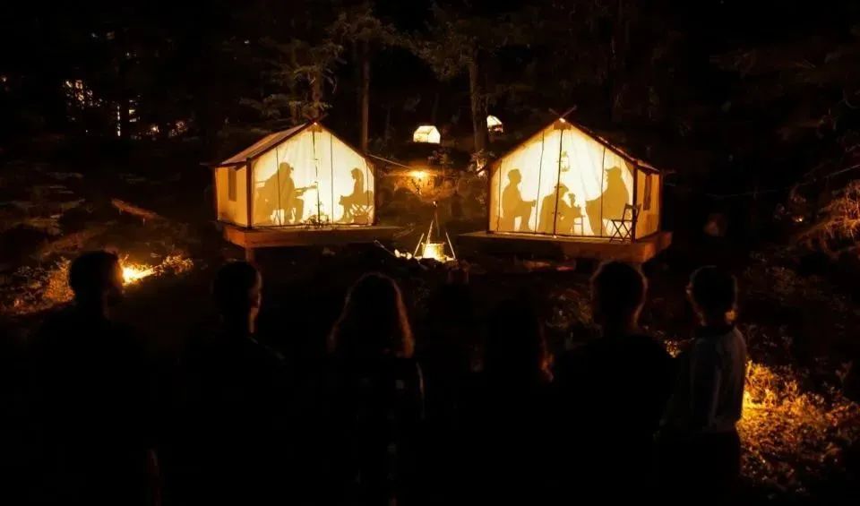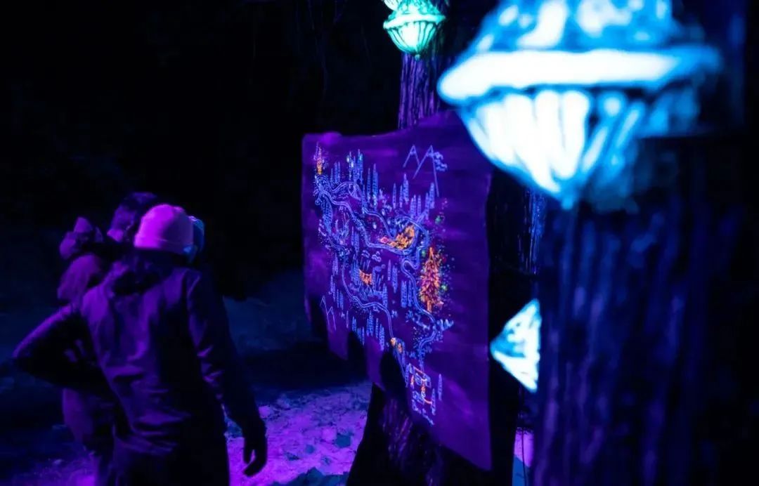 游客到達(dá)Shooting Stars區(qū)域時,無數(shù)的鐳射光投影在樹葉、樹干與流水之上,營造了星星降落于身邊的奇幻之感,仿佛置身于不同的時空;游客越過一座橋,橋邊有會說話的樹木,一切宛如魔法;還有篝火歌曲的吟唱等等。游客游覽的提示還隱藏在森林的海報(bào)和神秘的無線電信號中。