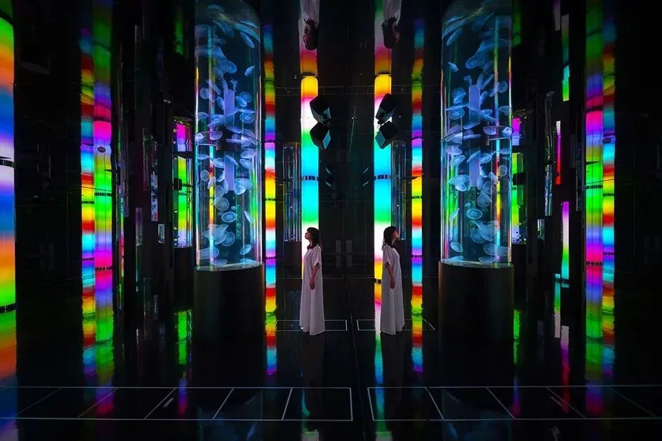 數(shù)個巨高的透明圓柱型矗立于此,隨著燈光與音樂的不斷變換,讓這個非凡空間充滿著夢幻的色彩,水母在柱內優(yōu)雅地“舞動”著......