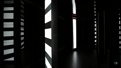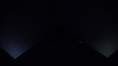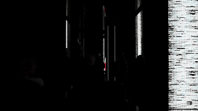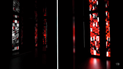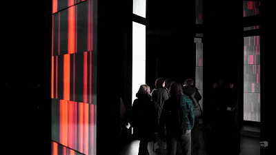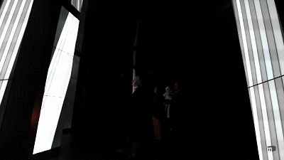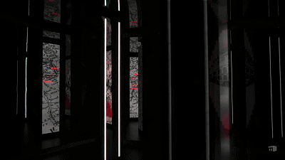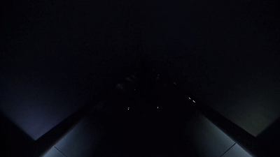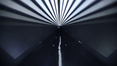 當(dāng)觀眾進(jìn)入被鎖關(guān)閉著的黑匣子時,他將被無數(shù)的鏡子碎片組成的一片片鏡面所包圍,并且,五個雕刻的顯示碑和LED燈呈現(xiàn)的圖形抽象動畫是暗室中的唯一光源。
