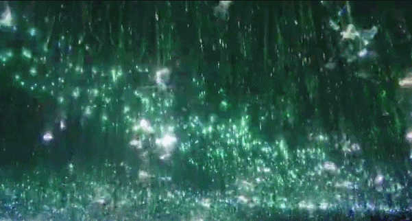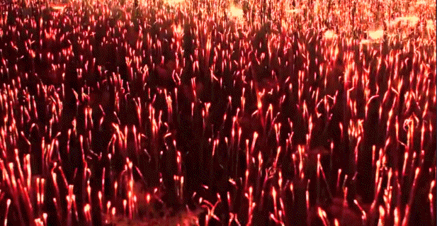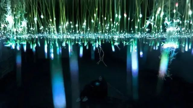 作品由120平方米的懸掛式人造草打造。這些人造草從空中自然的垂下來(lái),形成一個(gè)漂浮的綠色草地,并由6 臺(tái)定制激光動(dòng)畫投影儀,以及四聲道音響系統(tǒng)共同組成。