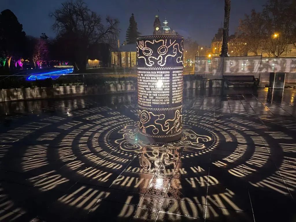 “承認國家”裝置以 Dja Dja Wurrung 標志性的燈塔屹立在羅莎琳德公園廣場上,這個兩米高的燈光雕塑燈火通明,其頂部和底部圍繞著 Dja Dja Wurrung 人們創(chuàng)作出的藝術作品。