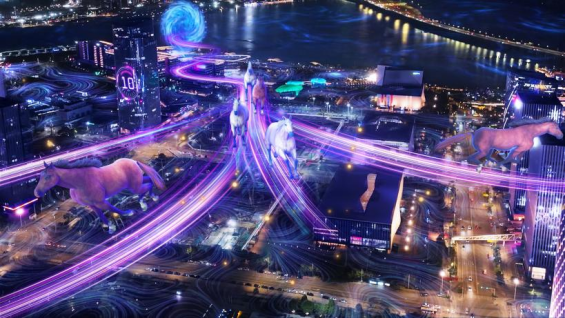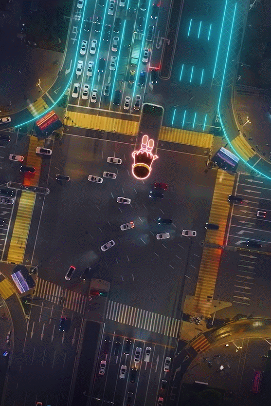 城市上空幻化出宇宙星空,未來城市的景觀隨著時間數(shù)字的不斷變化快速生長。航空航天,高鐵、5g、生物工程、工業(yè)建設等畫面快速閃回,閃現(xiàn)出寶安未來的蓬勃發(fā)展的意象。AR秀以寶安中心區(qū)未來城市主題收尾,巧妙使用元宇宙世界、深港巴士等元素,匯集“聲音”“光學”“自然”“科技”“交互”融合一體,是一場關于元宇世界的未來探索。