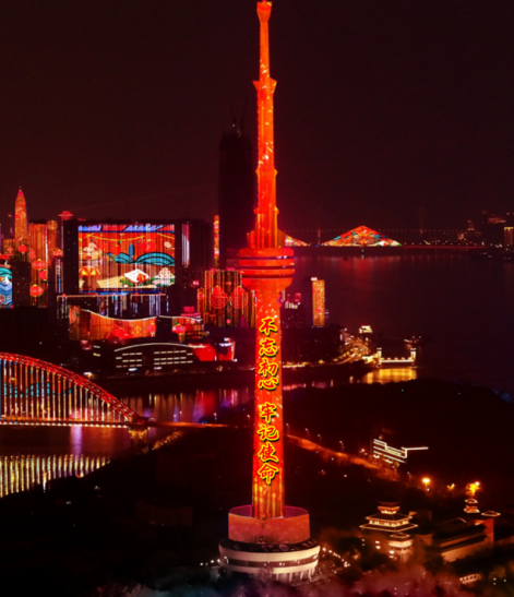 武漢兩江四岸沿線約25公里的建筑、橋體、山體和躉船碼頭被點亮,濃濃的新年年味撲面而來,新年的喜慶氛圍滿溢而出。