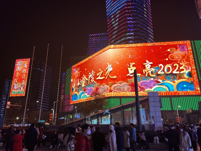 2023年1月1日0點,南京新街口跨年燈光秀準時點亮金陵城。當晚,大屏絢麗多彩的光影跨年首秀,為南京市民送上新年祝福,帶來奇幻奪目的視覺藝術體驗,吸引大家駐足觀賞、打卡拍照。隨著燈光秀畫面的變化,大家沉浸在斑斕的光影盛宴中,璀璨的燈光也點亮了新一年的希望,承載著對美好生活的向往。