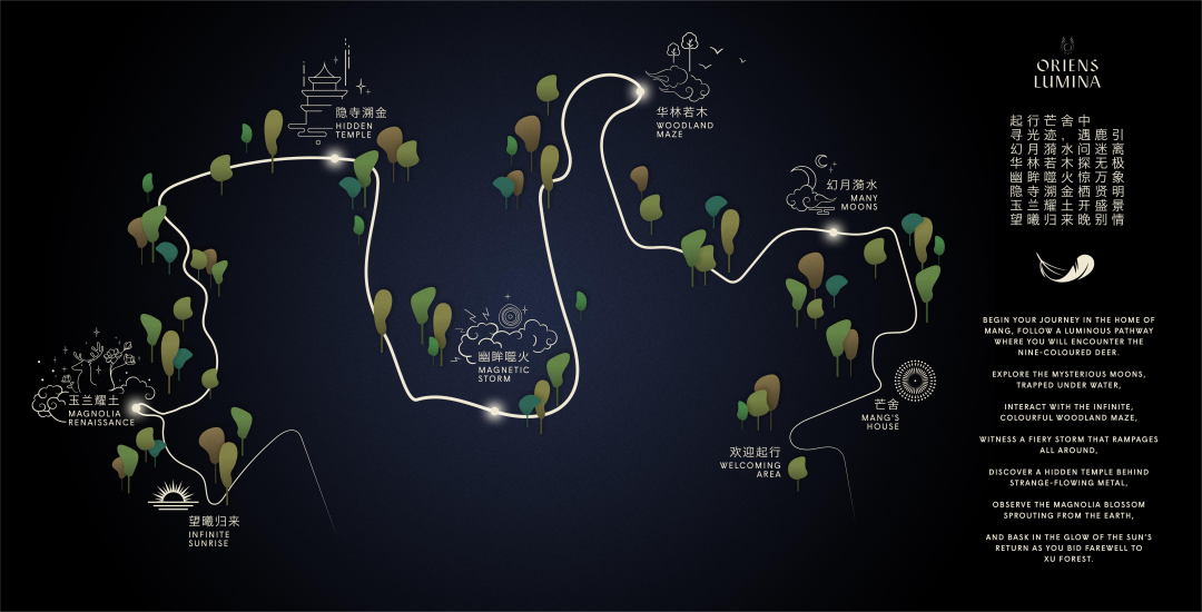 作為奉賢新城文旅項(xiàng)目年度扛鼎之作,LUMINA夜游項(xiàng)目總占地面積超8萬(wàn)平方米、游覽路線總長(zhǎng)約1.5公里。以中央公園現(xiàn)狀為基礎(chǔ),以傳統(tǒng)文化《山海經(jīng)》和陰陽(yáng)五行學(xué)說(shuō)為創(chuàng)作靈感,構(gòu)建出一個(gè)全世界面積最大、內(nèi)容最為豐富的Lumina夜游。整個(gè)森林之旅需要45分鐘到1小時(shí)。
