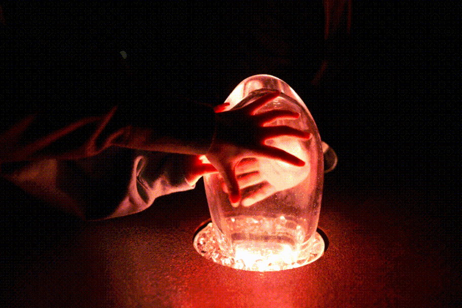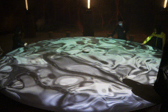 視野中間放置著一個(gè)巨大的圓盤(pán),這是一個(gè)多人互動(dòng)裝置,用雙上拂去圓盤(pán)上的沙塵,可以看見(jiàn)“賢文化”的具象顯示,而后是星漢燦爛的銀河圖景,美輪美奐。