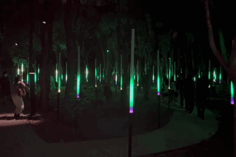 樹(shù)蔭婆娑,光影斑駁,通過(guò)互動(dòng)裝置,觀眾可以操控樹(shù)林中燈柱的發(fā)光顏色、頻率、位置等,或是明媚閃爍,或是暗光浮動(dòng),炫目的視覺(jué)色彩沖擊之下,傳遞的是“光”的情緒和色彩。