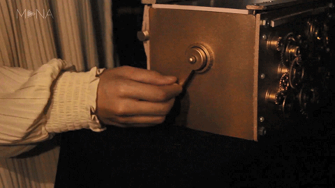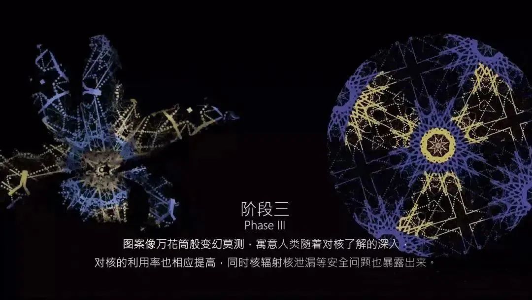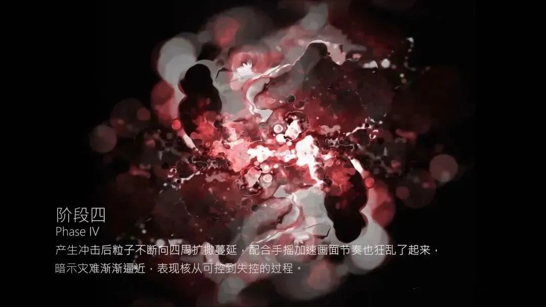 裝置整體分為投影和手搖控制兩部分。觀眾通過搖動握手裝置將速度控制在一定值,核花則以極速綻放;當(dāng)速度超過一定范圍時,核花會爆炸。通過裝置“核花”,創(chuàng)作者希望告訴我們:核能是福是禍——這完全取決于人類如何使用核能,而不是核本身。
