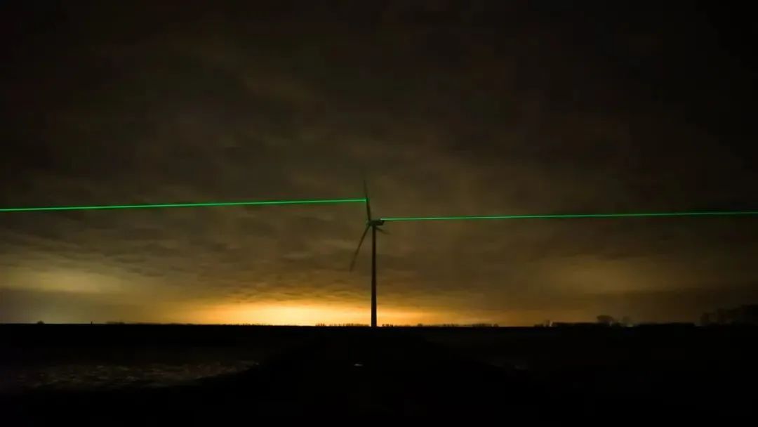 綠色激光束從一個風(fēng)車的頂部以光速穿越1600英尺的距離發(fā)射到下一個風(fēng)車的葉片,并追隨風(fēng)車葉片同步旋轉(zhuǎn),完美地實(shí)現(xiàn)了對高速運(yùn)轉(zhuǎn)物體的精準(zhǔn)定位!