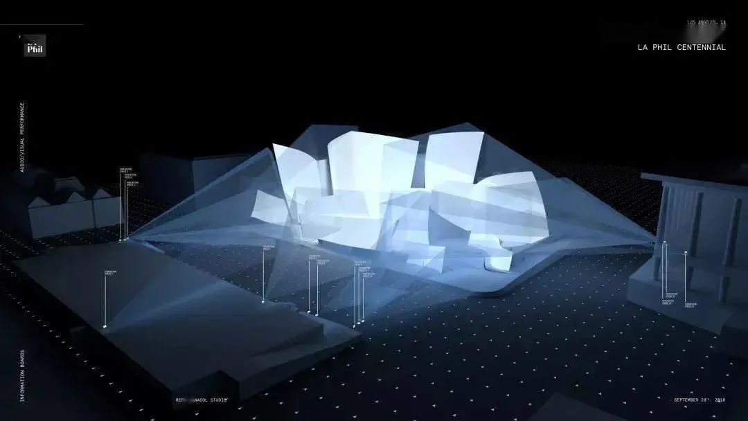 來(lái)自土耳其的數(shù)字媒體藝術(shù)家—— Refik Anadol 利用數(shù)據(jù),將他的藝術(shù)感觸結(jié)合數(shù)據(jù)轉(zhuǎn)化為的極具表現(xiàn)力光影藝術(shù)。沃爾特·迪斯尼音樂廳,坐落洛杉磯,擁有起伏的不銹鋼外觀。這一年Refik Anadol和他的團(tuán)隊(duì)接到一項(xiàng)任務(wù)將這座音樂廳打造為“夢(mèng)想”主題的大型藝術(shù)裝置。Anadol擅長(zhǎng)數(shù)據(jù)整合創(chuàng)作于是他提出:“用一種創(chuàng)造性的、計(jì)算機(jī)化的“大腦” 來(lái) 模仿人類 如何做夢(mèng),通過(guò)處理記憶來(lái)形成圖像和想法的新組合。”