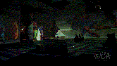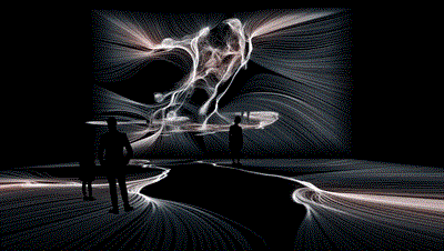 沉浸式藝術(shù)展、藝術(shù)裝置的迅速發(fā)展,使得藝術(shù)創(chuàng)作手法也愈發(fā)多樣化,大量獨(dú)立先鋒主義的新興藝術(shù)裝置,借助抽象的線條或視覺圖形、生活實(shí)物變形來(lái)完成藝術(shù)裝置的敘事設(shè)計(jì)。Fields是Tobias Gremmler的作品,他為場(chǎng)景裝置創(chuàng)作的變形虛擬舞者被投射在平行的紗幕上。