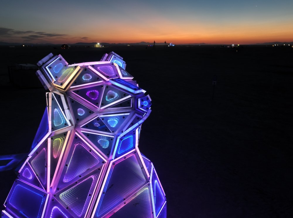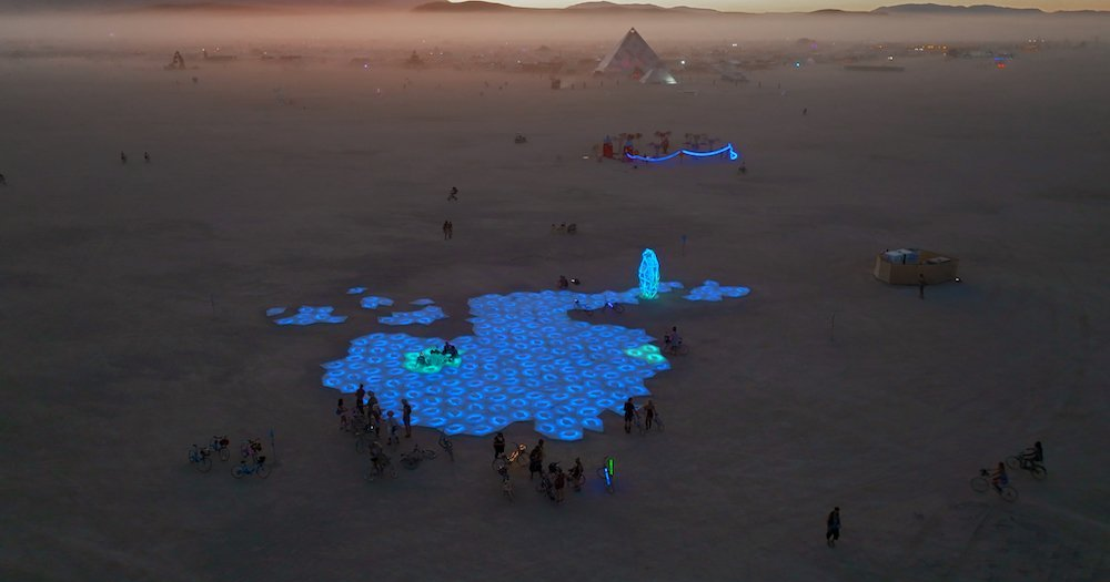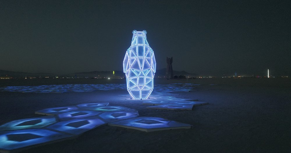 白天,《最后的海洋》突出了回收海洋塑料的轉(zhuǎn)變,表面呈藍(lán)色和白色顆粒漩渦狀。到了晚上,它會(huì)發(fā)出充滿活力的動(dòng)畫燈光。參與者可以在光波中飛躍起舞,照亮我們海洋的有機(jī)和強(qiáng)大的本質(zhì)。