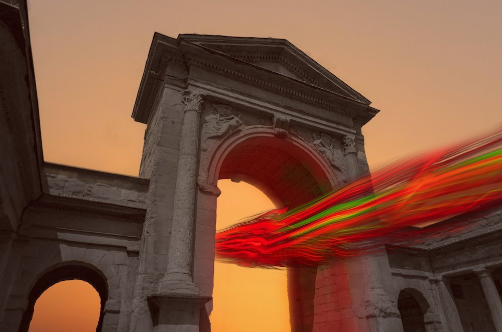 裝置被反射材料包裹。白天,古典的拱廊、流動的天空、樹影和草茵被投影在表面之上,物體與環(huán)境的界限變得模糊,裝置本身也成為永動的藝術(shù)。夜幕降臨,裝置變得透明且空靈,燈光矩陣呈現(xiàn)出極具未來感的氣質(zhì)。“動量”將虛擬藝術(shù)與實(shí)體裝置相結(jié)合。AR 增強(qiáng)現(xiàn)實(shí)技術(shù)打破了時空壁壘,觀眾可通過社交媒體上的按鈕,自發(fā)創(chuàng)作,讓數(shù)個以裝置“動量”為原型的反光立方體漂浮于不同場域的鏡頭下。