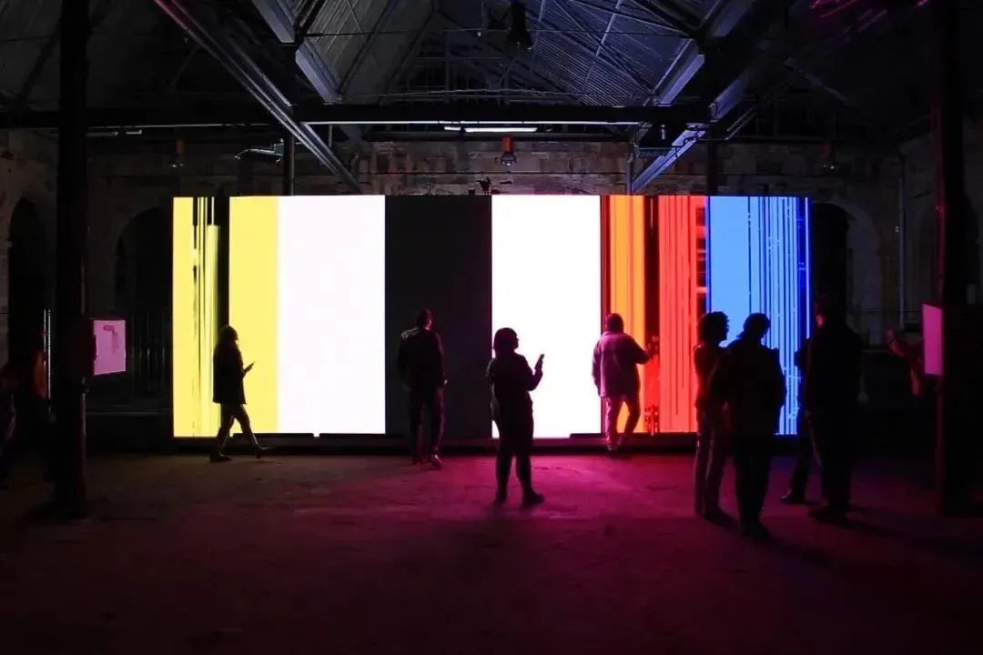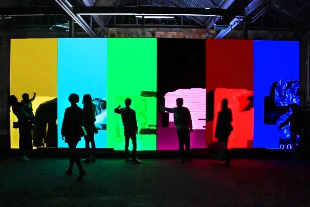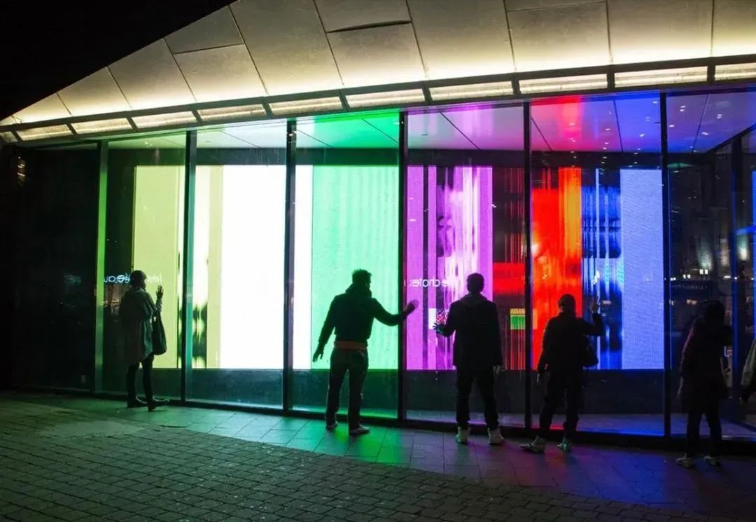 這件作品展示在一面巨大的 LED 墻上,采用幾個垂直彩條的形式,類似于電視信號斷開時會出現(xiàn)的情況。當參與者觸摸 LED 屏幕時,系統(tǒng)會調(diào)諧到實時電視信號并播放隨機片段,這些片段會隨著觀眾的手部動作變化而出現(xiàn)失真。