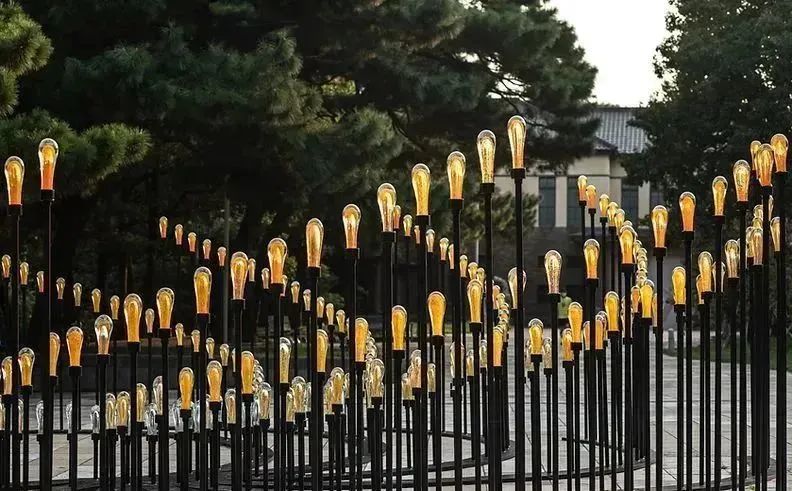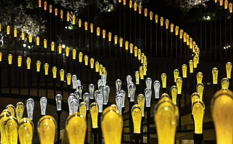 作品「透明苑」主體由300多顆手工吹制的雙層水滴玻璃組成,并將玻璃燈柱以對稱方式陣列排序,形塑出一種象征信仰的意象。