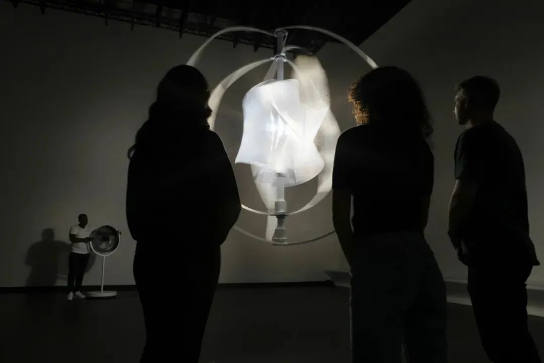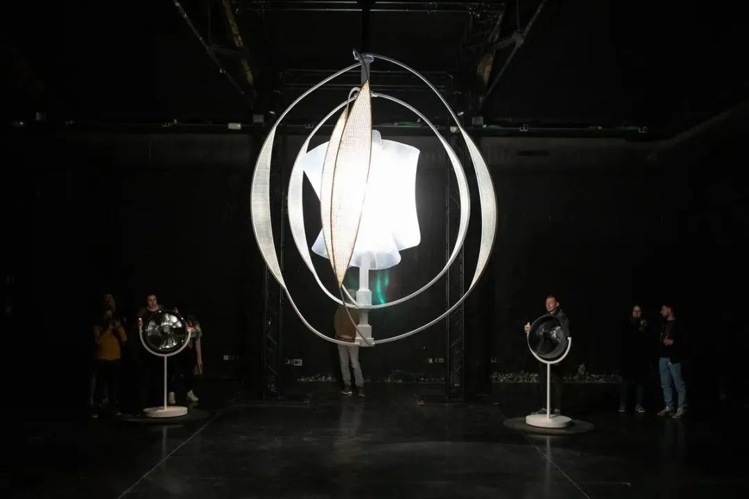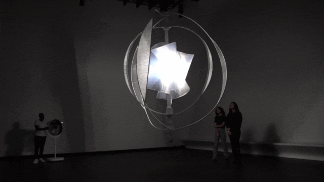 裝置由一系列直徑為3米的半透明“刀片”,圍繞著一根6米長(zhǎng)的中央螺旋線構(gòu)成,參觀者可以轉(zhuǎn)動(dòng)裝置周圍的風(fēng)扇,讓雕塑旋轉(zhuǎn)起來(lái)。