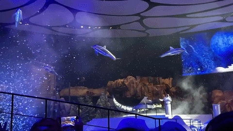 這場(chǎng)沉浸式表演采用了多媒體技術(shù)和最先進(jìn)的空間音效,通過(guò)一個(gè)高15米、寬218米的360°全景大屏幕,將各種海洋奇觀栩栩如生地呈現(xiàn)在觀眾面前。