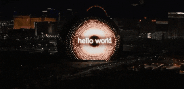 Exosphere擁有令人印象深刻的配置,由大約1萬個LED冰球組成,以2英寸的間隔均勻分布。每個冰球都配備了 48 個獨立的 LED 二極管,能夠展示驚人的 256.4 億種不同的顏色。球體的表演以熱情的問候“Hello World”拉開帷幕。