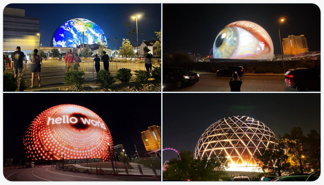 2023 年4月,由 Populous 設(shè)計的未來主義音樂場地球體 The Sphere 點亮了拉斯維加斯的天際線,并將其變成了一個迷人的照明奇觀。在首場演出期間,球體的外觀,被稱為Exosphere和世界上最大的LED屏幕,用于迷人的展示,展示了動畫場景,包括煙花,月球,甚至一個巨大的眨眼球,用“你好世界”的信息迎接客人。