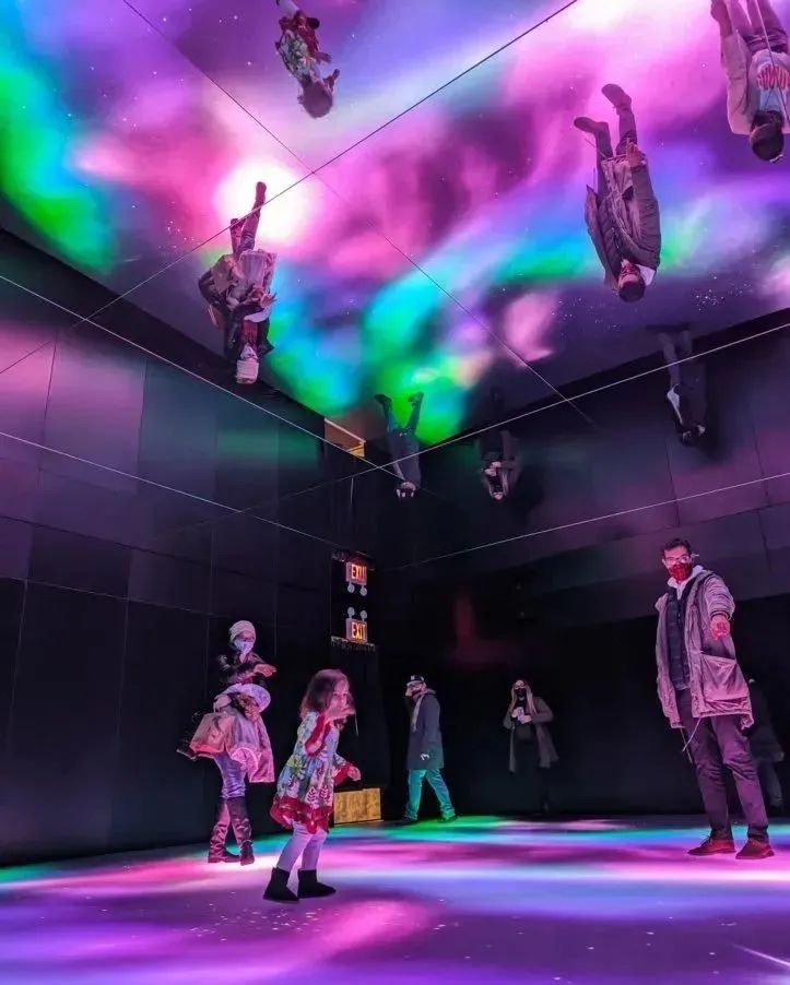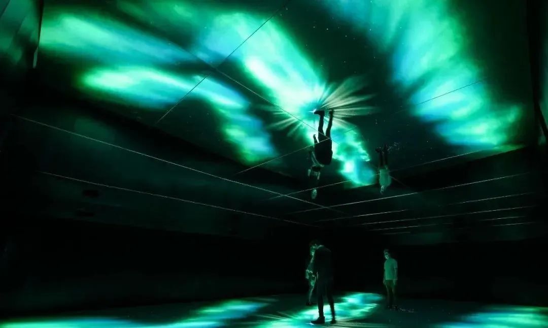 《走進北極光》設(shè)計團隊利用地板上的 LED 屏幕、鏡面天花板、360° 音頻系統(tǒng)和 3D 傳感器等,把北極光搬到了參觀者的眼前。