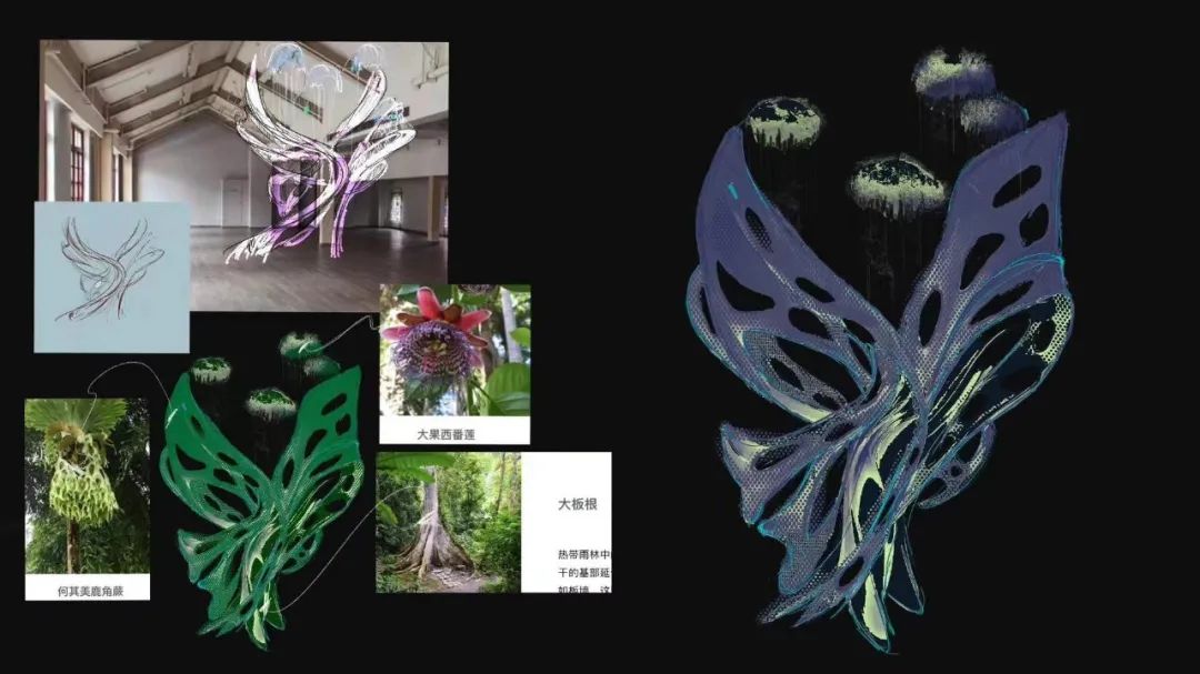 靈感來源于何其美鹿角蕨,大板根和大果西番蓮這三種植物,借鑒了大板根的特色寬厚板根,何其美鹿角蕨的葉片形態(tài)和大果西番蓮的葉片形態(tài),綜合生成了優(yōu)雅仙氣十足的裝置花藝。