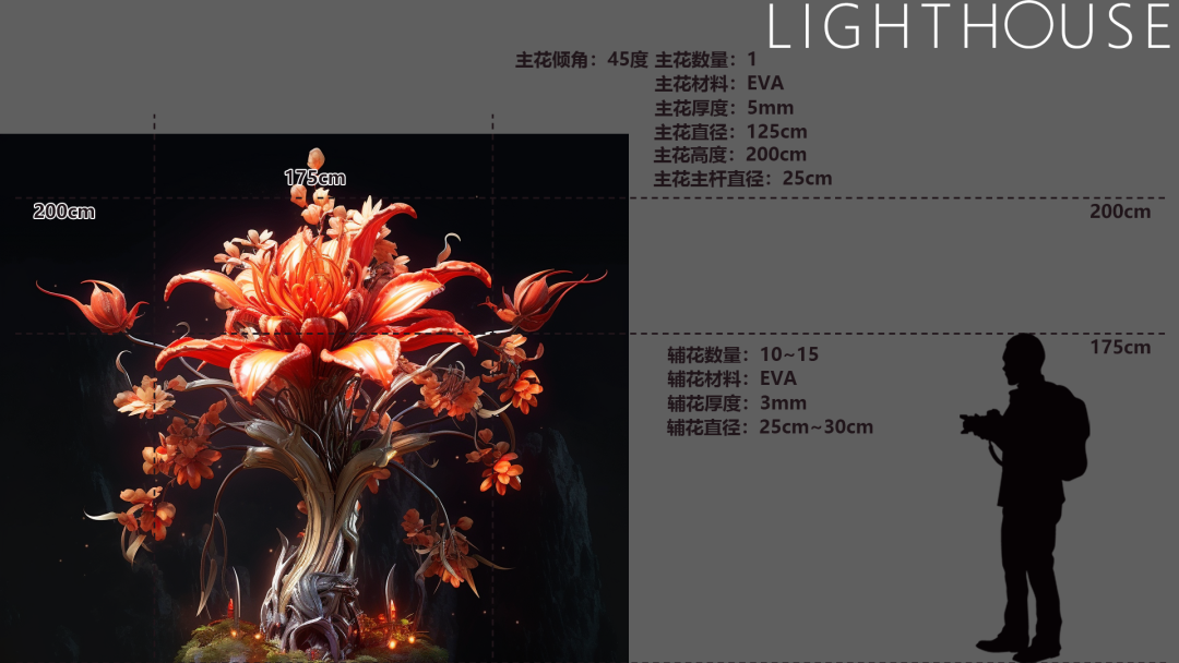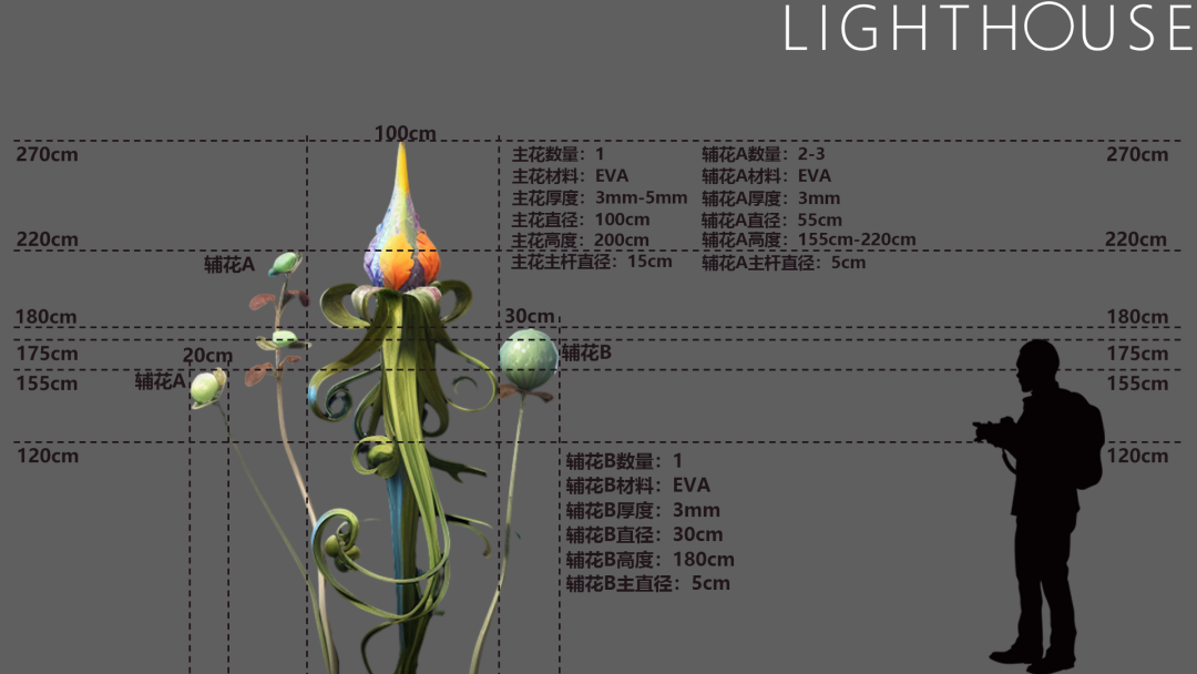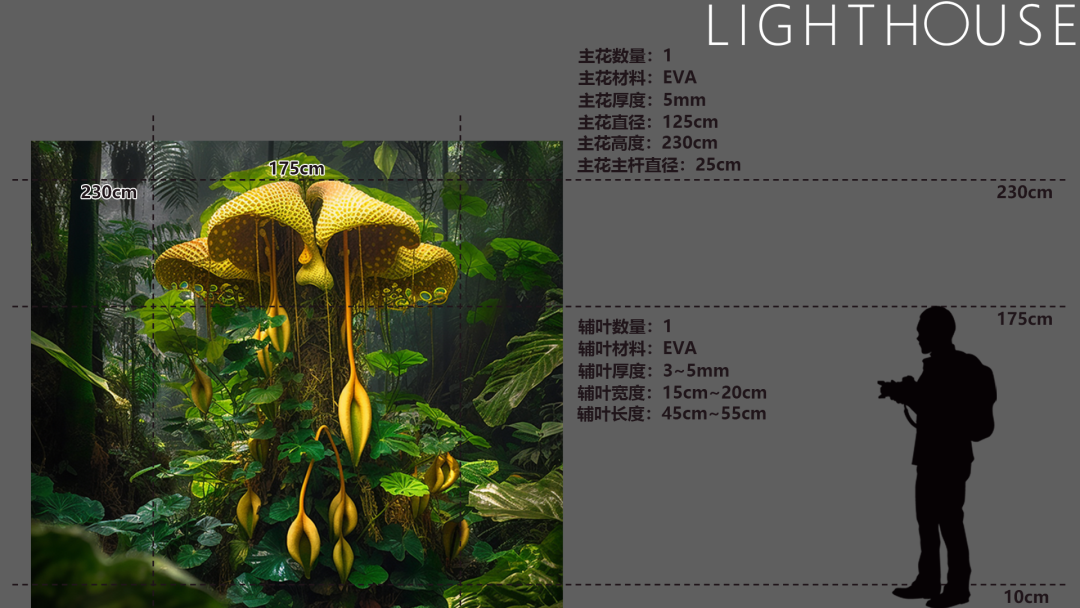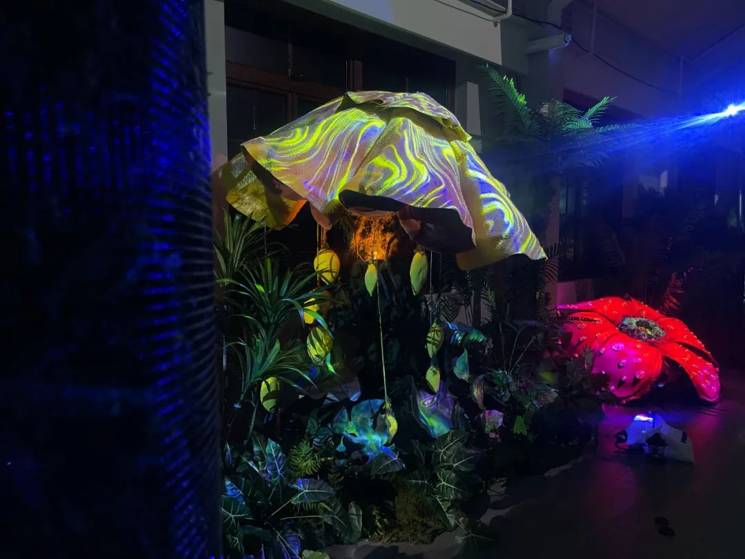 LightHouse作為特邀藝術(shù)創(chuàng)作團(tuán)隊(duì),借鑒熱帶雨林中的雨林生態(tài)系統(tǒng),并提取了雨林植物的特性,利用數(shù)字媒體光影的形式賦予多元化的藝術(shù)美感。通過巨型奇異花植裝置、數(shù)字光影、雨林植物營造以及露營元素的融合,希望為觀眾提供多維度感官體驗(yàn)。讓城市人身臨其境地感受雨林的魅力,在城市的雨林中了解雨林植物和現(xiàn)象的知識,體會雨林對我們生存的重要意義。